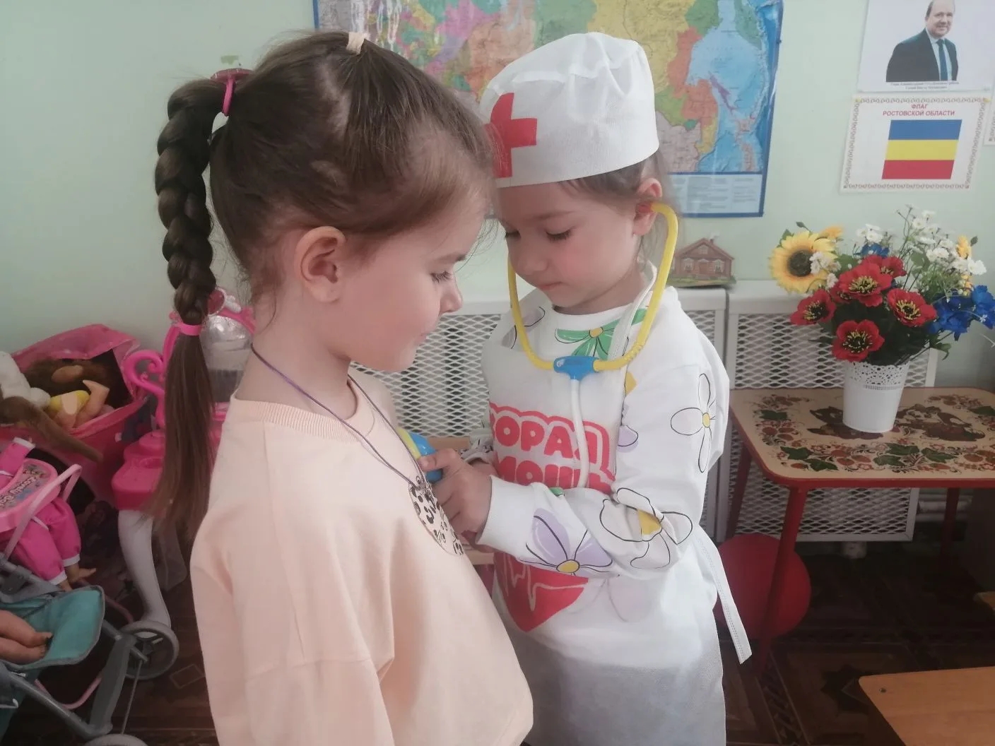 Здоровье — это не только спорт, но и знания. В группах прошли тематические беседы: педагоги вместе с детьми рассматривали красочные плакаты и обсуждали, что полезно для организма. Закрепить знания помогла дидактическая игра «Доктор»: ребята с интересом примеряли на себя роль врачей, учились заботиться друг о друге и узнали, что поход в больницу может быть совсем не страшным.