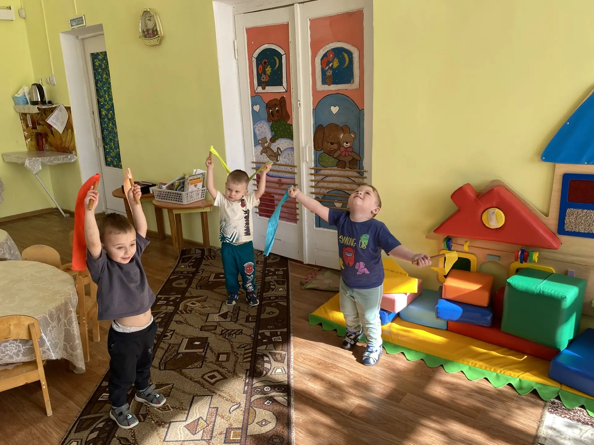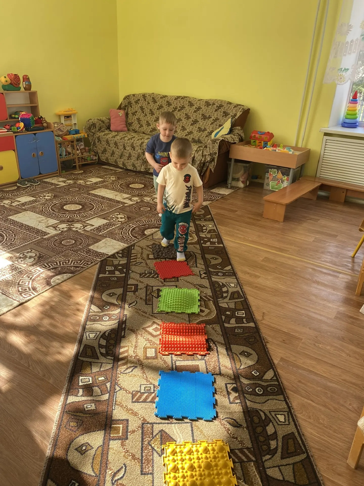Наши самые маленькие воспитанники встретили день весёлой зарядкой. Под ритмичную музыку малыши старательно выполняли упражнения, заряжаясь отличным настроением. А чтобы укрепить иммунитет и развить координацию, ребята отправились в путешествие по «дорожкам здоровья» — тактильным тропам, которые так любят дети.