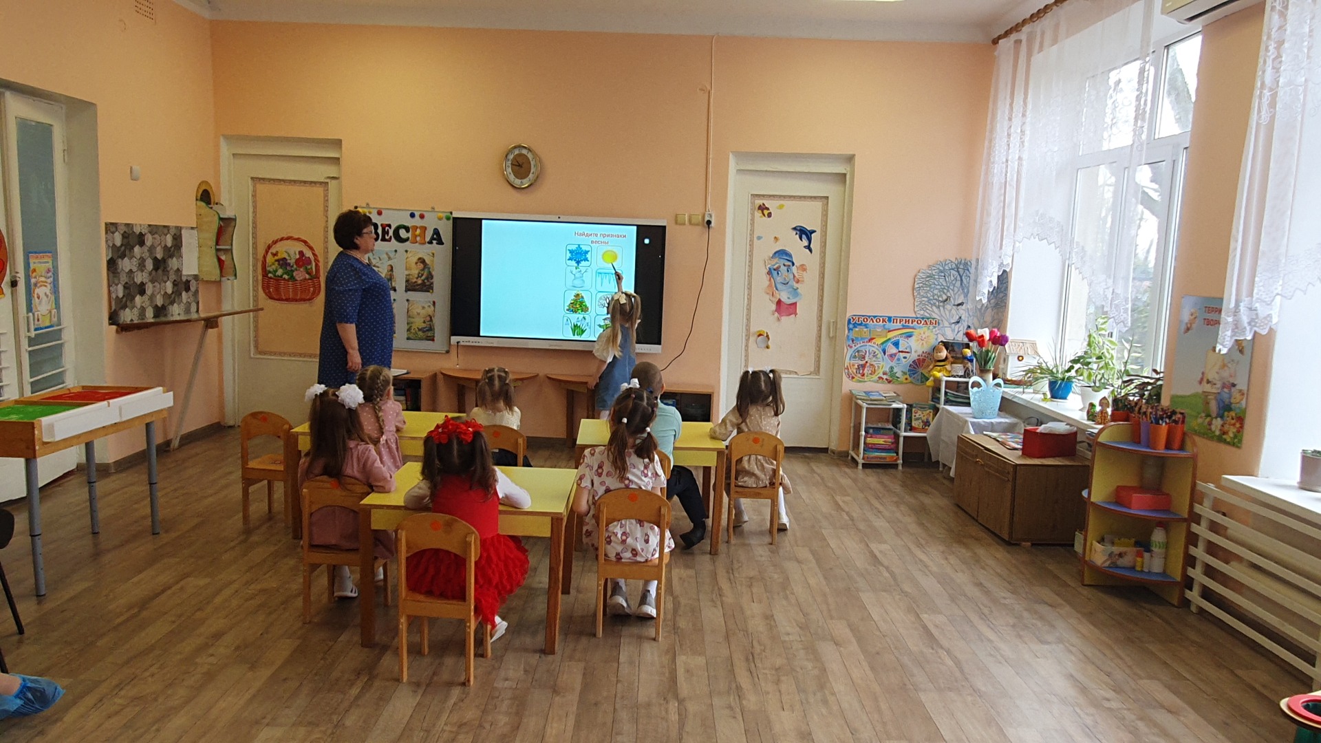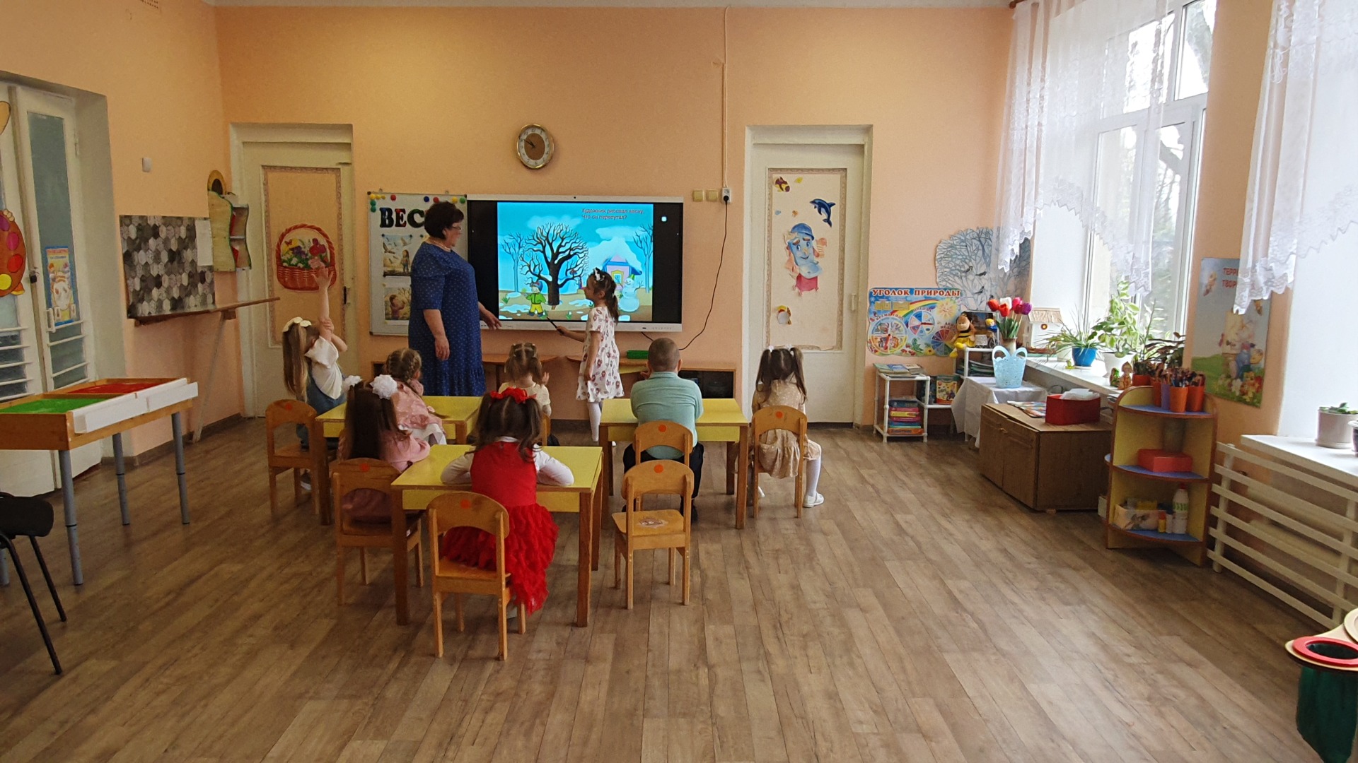 В начале занятия педагог Л.А. Мананкова вместе с воспитанниками повторила основные признаки весны. Яркая и наглядная мультимедийная презентация на интерактивной панели помогла детям вспомнить, как тает снег, бегут первые ручьи и возвращаются перелетные птицы. Ребята с интересом следили за сменой кадров, активно отвечая на вопросы.