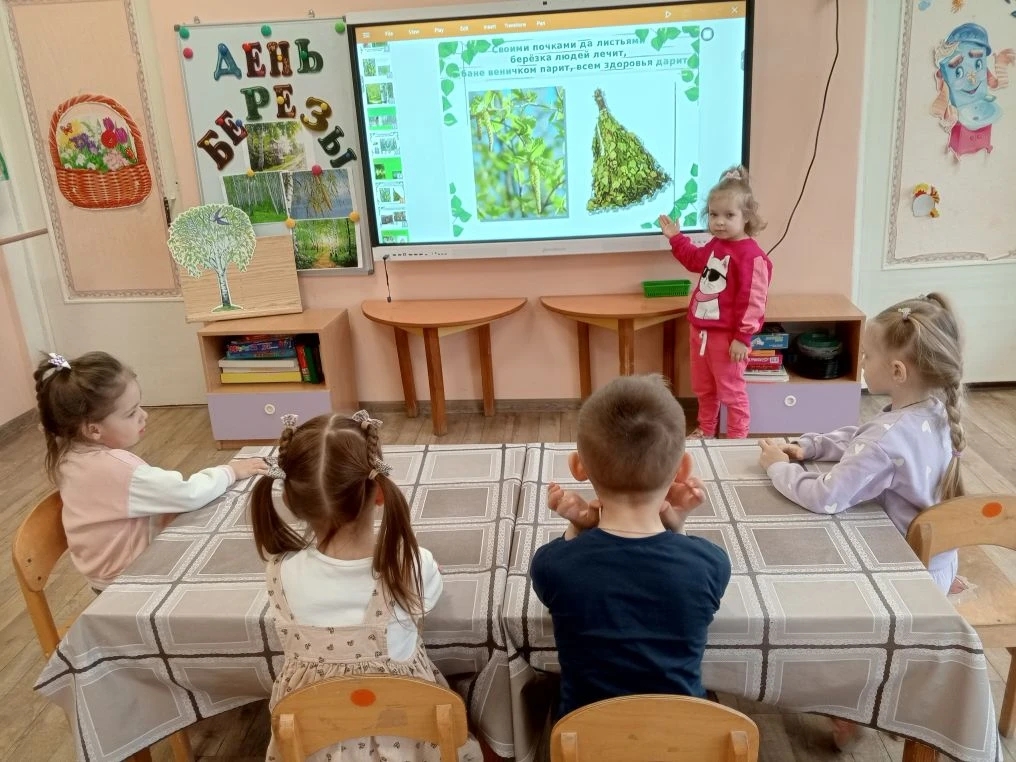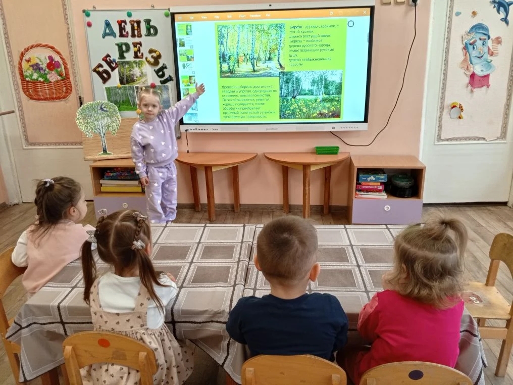 В ходе увлекательной презентации ребята узнали, почему это дерево называют «добрым»: какую пользу оно приносит людям и чем отличается от других лесных жителей. Знакомство с родной природой продолжилось в мире искусства — дети с интересом рассматривали репродукции картин известных художников, воспевавших красоту русской души через образ берёзы.